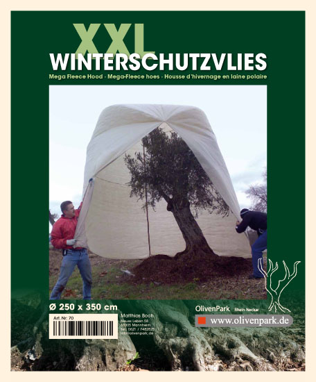 - Unsere Vlieshauben mit Reißverschluss (XL und XXL) einfach u. bequem anzuwenden für Ihren Olivenbaum/Palme zum Schutz vor Frost u. Eis. Ebenso wird Ihre Pflanze vor der Sonneneinstrahlung geschützt, welche den letzten Saft aus den Blättern verdunsten lässt. Leider wird über den gefrorenen Boden keine weitere Flüssigkeit den Blättern bzw. Ästen zugeführt, so dass Ihre Pflanze vertrocknet. Wurde von uns mit Erfolg im Jahrhundertwinter 2008/2009 als auch 2009/2010 getestet und angewandt (eine zusätzliches Heizsystem unter der Vlieshaube wird von uns empfohlen).