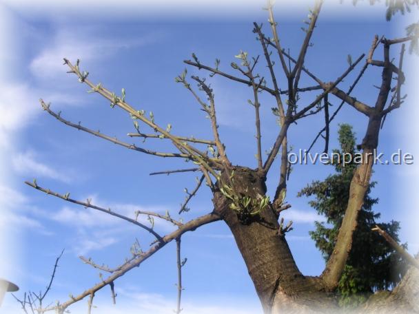 - Aufgrund unseres verwendeten Winterschutzes (Vlieshaube, Heizsystem...) verloren unsere Olivenbäume nicht alle Blätter. Somit blieben die Triebe bis in die Spitzen saftig, mit unserem Dünger "OlivoSOL + PhytoSOL" gedüngt, so dass der Austrieb auch in diesem Jahr wieder rasch voranging.
