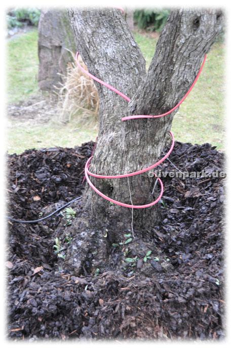 Unsere Winterschutzsets enthalten Pflanzenheizungen (Wurzelheizung) für Wurzel, Stamm und Krone. Die in Deutschland hergestellten Heizsysteme werden über einen Temperaturschalter geregelt und beschädigen nicht das Holz sowie die dazugehörigen Winterschutzmaterialien wie Vlieshaube und Jute. Wir vom OlivenPark unterstützen Sie beim Olivenbaum überwintern.