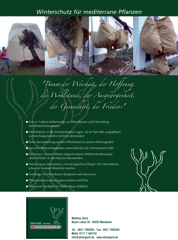 Der vergangene Winter 2011/2012 war wieder eine richtige Herausforderung für die Olivenbäume und unseren Winterschutz. Stolz können wir berichten, dass wir mit der Auswahl unserer Olivenbäume (richtige Sorte), den funktionellen Winterschutz und unsere langjährige Erfahrung, wieder einmal erfolgreich einen "Hammer-Winter" mit unseren europaweiten Kunden überstanden haben. Seit letztem Jahr bekommen alle unsere Fans auf Facebook, die notwendigen Pflegeschritte sowie Handhabung im Winter, immer aktuell von mir gepostet. Werde Fan von "OlivenPark" und lass dich und dein Olivenbaum von mir durch das Jahr begleiten.